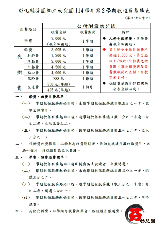 114學年度第2學期收退費基準表